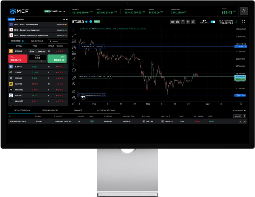 The MCF Platform combines advanced trading tools with a seamless, exchange-like experience. Featuring TradingView integration – renowned for its charting features –, over 130+ crypto pairs, and an intuitive interface, it’s ideal for crypto prop traders seeking a streamlined, intuitive and yet sophisticated trading environment.